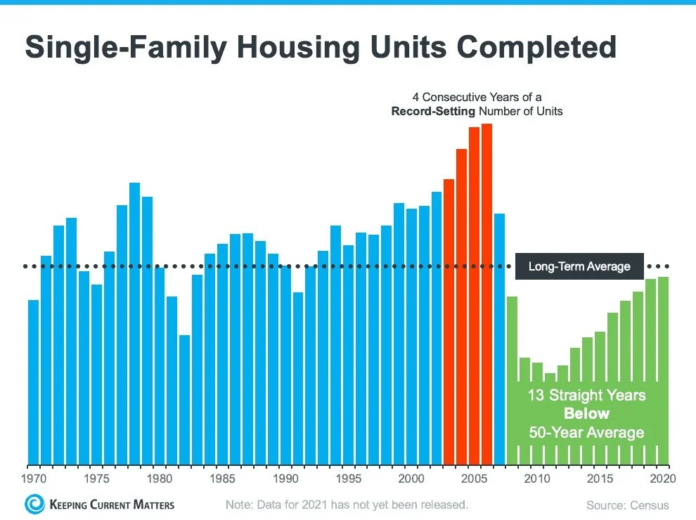 Since then, the level of new home construction has fallen off. For the last 13 straight years, builders haven’t been able to construct enough homes to meet the historical average (as illustrated in green on the graph). That underbuilding left us with a multi-year inventory deficit going into the pandemic.