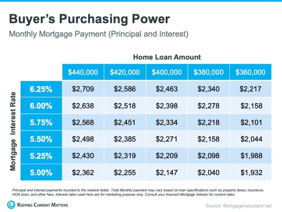 That’s because when rates go up (as they have for the majority of this year), they impact how much you’ll pay in your monthly mortgage payment, which directly affects how much you can comfortably afford. The inverse is also true. A decrease in mortgage rates means an increase in your purchasing power.