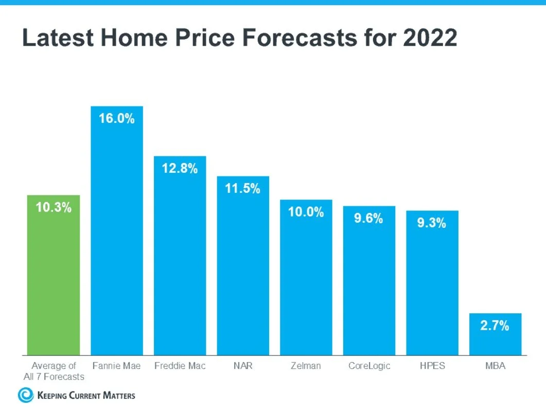 This year, home price appreciation is slowing (or decelerating) from the feverish pace the market saw over the past two years. According to the latest forecasts, experts say on average, nationwide, prices will still appreciate by roughly 10% in 2022 (see graph below):
